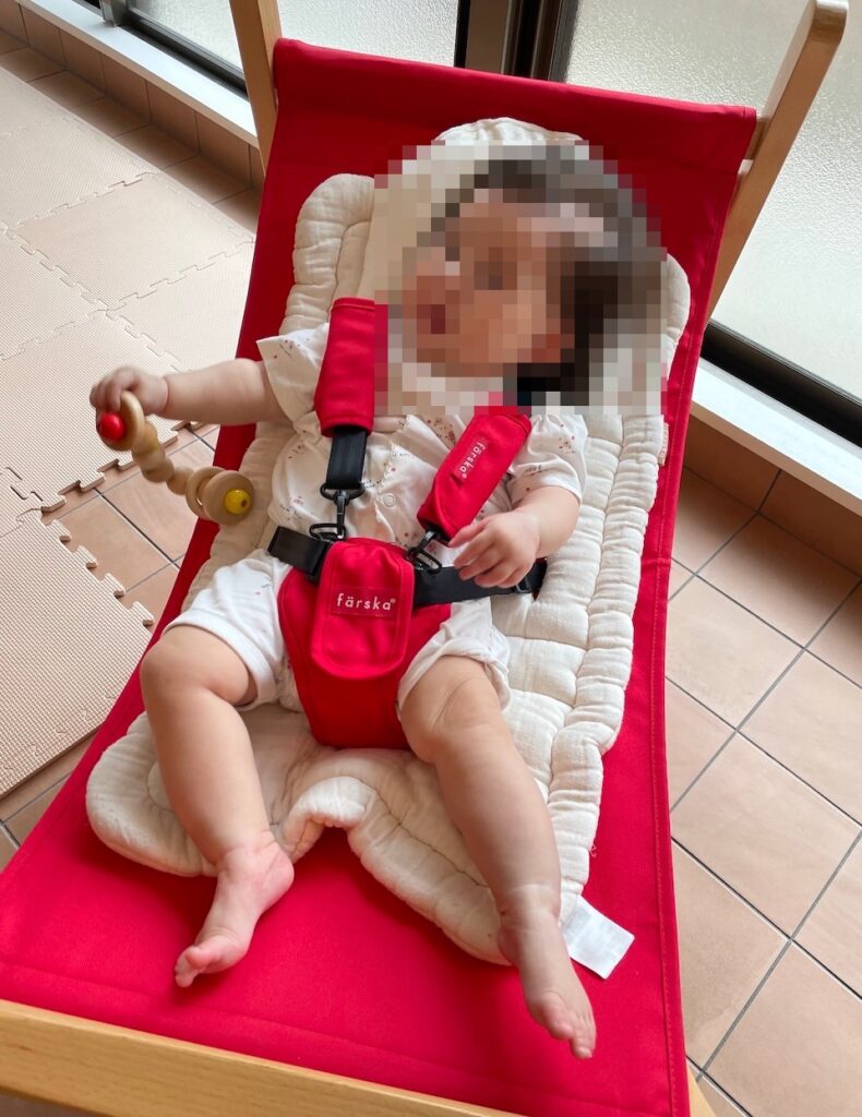 次はデメリットです。これは我が家だけのデメリットかもしれませんが、赤ちゃんの成長に従って足をイスにセットするのが大変になりました。太ももがたくましい赤ちゃんはゆとりのあるイスにした方がいいかもしれません。