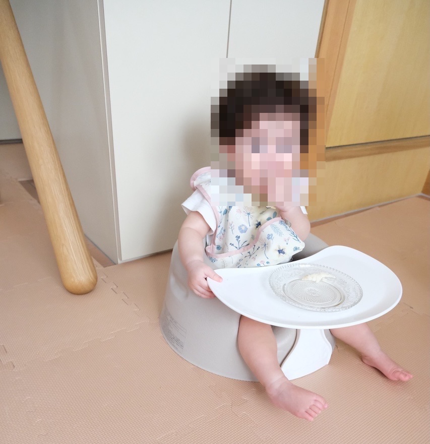 メリットとしては、床で座ってご飯をあげれるところだと思います。高いテーブルでいきなり離乳食を始めるのは少し怖かったのでBumboを使いました。